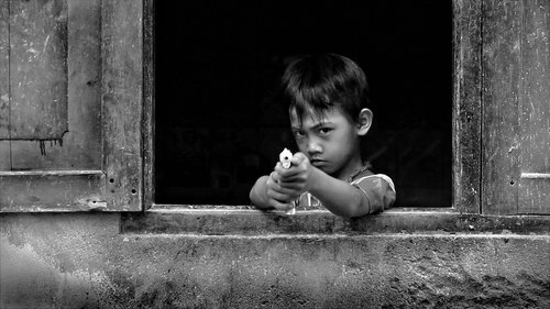 A child plays in the backyard. He is ignorant of anything going on around him...