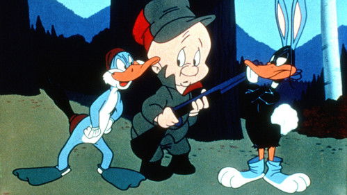 Daffy Duck and Bugs argue back and forth whether it is duck season or rabbit season. The object of their arguments is hunter Elmer Fudd.